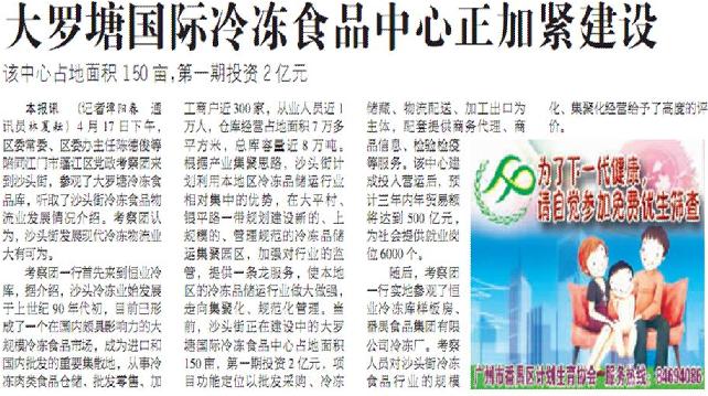 考察团一行首先来到恒业冷库,据介绍,沙头冷冻业始发展于上世纪90年代初,目前已形成了一个在国内颇具影响力的大规模冷冻食品市场,成为进口和国内批发的重要集散地,从事冷冻肉类食品仓储、批发零售、加工商户近300家,从业人员近1万人,仓库经营占地面积7万多平方米,总库容量近8万吨。根据产业集聚思路,沙头街计划利用本地区冷冻品储运行业相对集中的优势,在大平村、银平路一带规划建设新的、上规模的、管理规范的冷冻品储运集聚园区,加强对行业的监管,提供一条龙服务,使本地区的冷冻品储运行业做大做强,走向集聚化、规范化管理。当前,沙头街正在建设中的大罗塘国际冷冻食品中心占地面积150亩,第一期投资2亿元,项目功能定位以批发采购、冷冻储藏、物流配送、加工出口为主体,配套提供商务代理、商品信息、检验检疫等服务。该中心建成投入营运后,预计三年内年贸易额将达到500亿元,为社会提供就业岗位6000个。